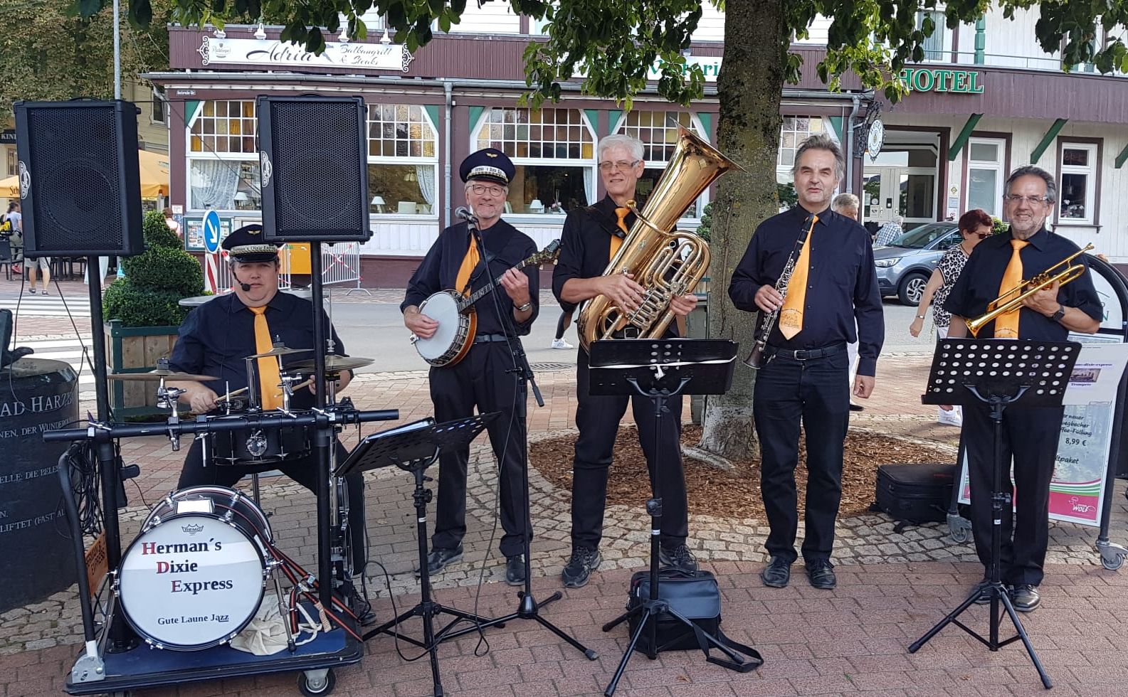 Herman’s Dixie Express gibt sich die Ehre. Die fünf jazzverrückten Musiker präsentieren ihre Auffassung vom Dixieland. Sie verstehen diesen Jazzstil vor allem als Entertainment und halten wenig vom ernsten akribischen Jazzpurismus. Und genau das mag ihr Publikum.