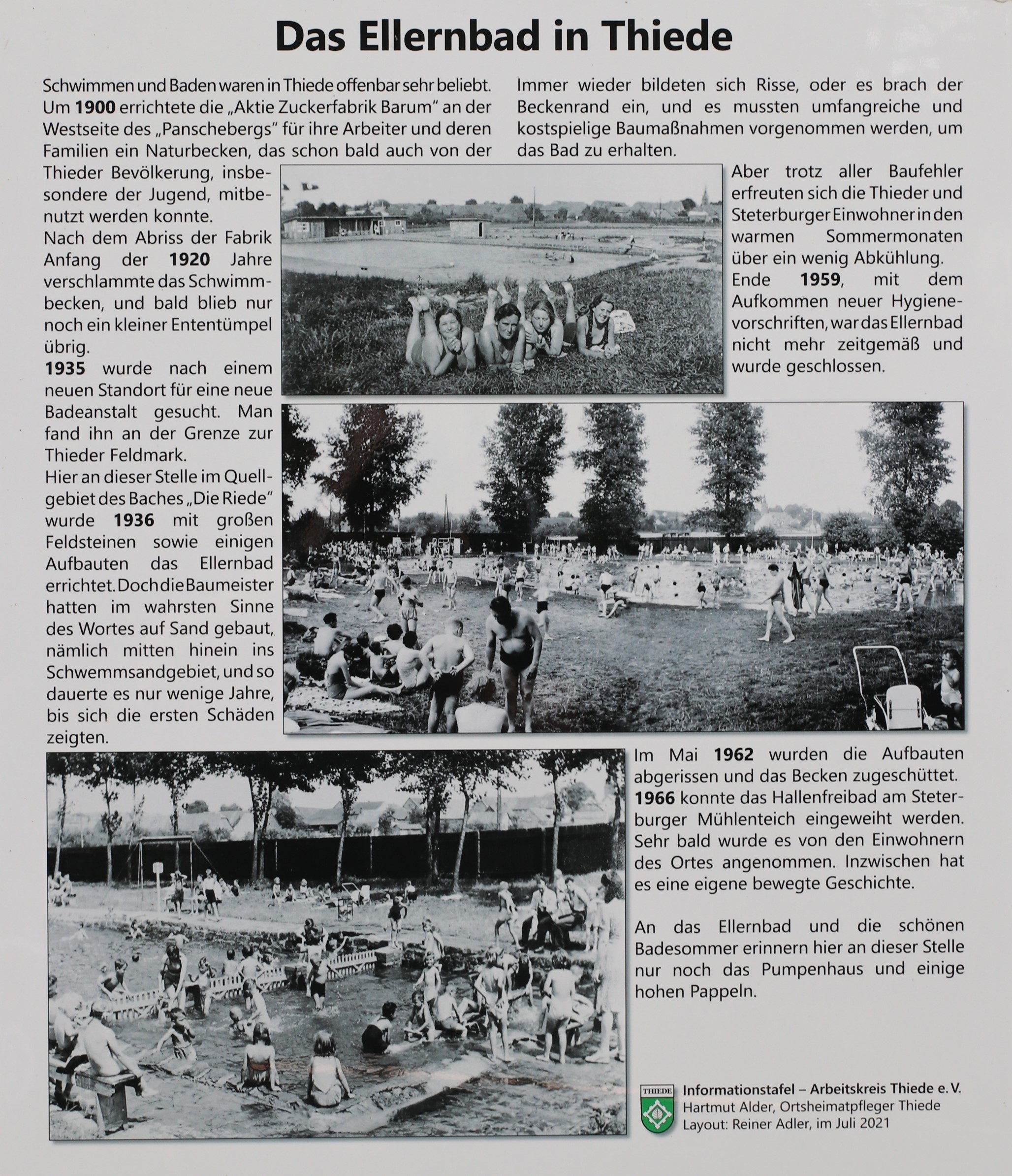 Am Sonntag, den 24.9.2023, trafen wir uns am Ende des Ellernweg an der alten Badeanstalt in Thiede, um die Informationstafel offiziell einzuweihen. Ursprünglich sollte das Schild, welches in Zusammenarbeit mit Hartmut Alder und Reiner Adler gestaltet und angefertigt worden ist, bereits im Sommer 2021 aufgestellt werden.