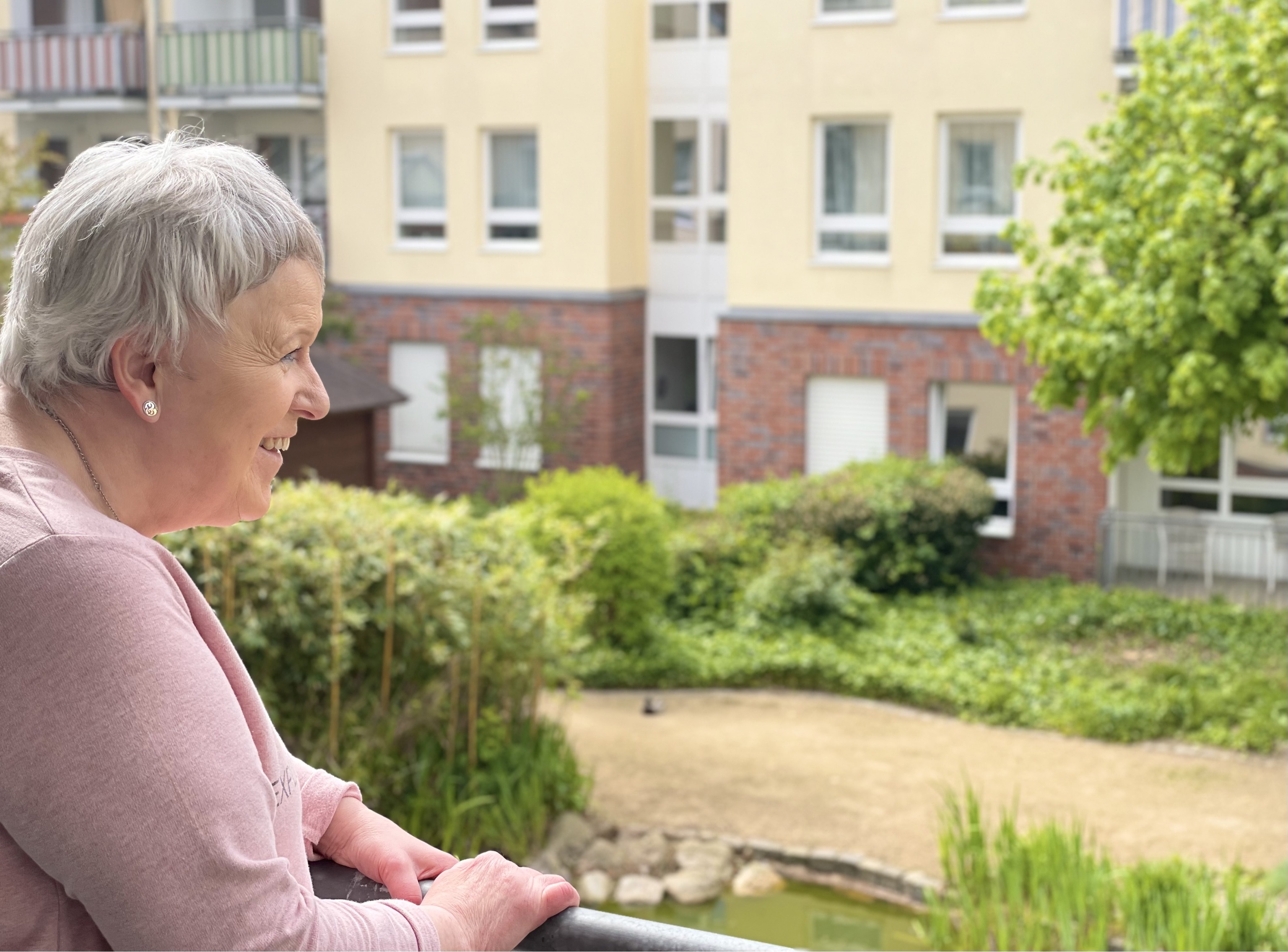 Frau Krause: „Ich lebte vorher im Kreis Gifhorn in einem Haus mit meiner Mutter. Ich bin seit 14 Jahren verwitwet, wir hatten keine Kinder, und als meine Mutter starb, besuchte ich mit meinem Patenkind mehrere Einrichtungen. Die Residenz war die Letzte und genau die Richtige. Mir war schon immer klar, dass ich in ein Service Wohnen ziehen würde, bevor ich allein sein würde- ich hatte schon viele Jahre zuvor im Internet recherchiert. Mein Hauptgrund ist der Faktor „Gesellschaft“. Wenn ich Ruhe brauche, ziehe ich mich in meine Wohnung zurück, ansonsten gehe ich vor die Tür und treffe sofort jemanden zum Reden. Nach der Besichtigung sagte ich sofort: „Hier könnte ich leben!“ Ich könnte stundenlang auf meinem Balkon stehen und auf den Teich mit den Enten, Schildkröten und Fischen schauen. Da ich selbst einen Teich hatte, hat mich der Blick in den Lindengarten von meiner Wohnung aus gleich fasziniert.“